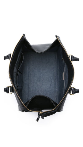 The Sandrine, Clare V's chic interpretation of a classic duffel, in black vegetable-tanned leather. Features a flat base with protective feet, an interior drop pocket and separated compartments to easily organize your essentials. Extended top zip for an extra roomy opening. Leather is minimally-treated and has a matte, natural finish while still maintaining a subtle shine. 5" handle drop. 13 " x 8" x 9"