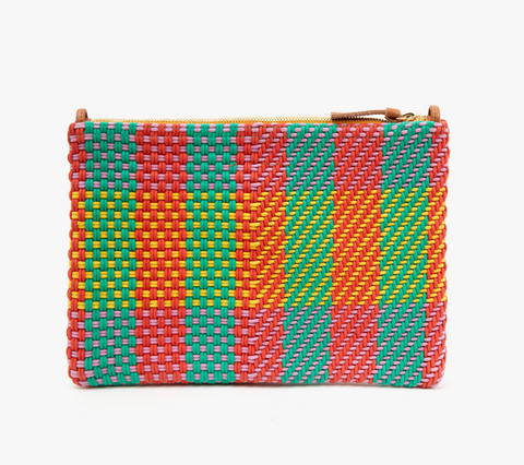 Clare V's popular flat clutch is reimagined with top tabs so you can attach any strap. In woven cotton "condesa" multi plaid. Marigold zipper closure and no lining. Add one of Clare V's shoulder, crossbody or shortie straps to the top leather loops and convert the clutch into a crossbody or mini tote. No interior compartments or pockets. Shown with lavender resin shortie strap, sold separately. Professionally clean and handle with care during use. 11 1/2" x 8"