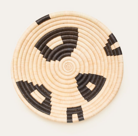 Indego Africa's Forms plateau basket in natural and with black geometric forms. Artisans practice a time-honored Rwandan weaving technique, using a needle and thread to wrap hand-dyed strands of sisal (the inside fibers of an agave plant) around bunches of sweetgrass to create these tightly coiled, durable baskets. Each basket can take one weaver anywhere from 60-70 hours to make. Handcrafted by the women of the Covanya collective using sustainable, locally-grown sweet grass and sisal. Use as a catchall or as a decorative feature on the table or wall. Loop on back for hanging. 12" x 3"