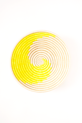 The Citron Swirl Plateau Basket from Indego Africa features striking citron yellow and the traditional motifs of Rwanda. Handcrafted by the women of the Covanya collective using needles & fine threads of sustainable, locally-grown sweet grass and sisal. Use as a catchall or as a decorative feature for your table or wall. Loop on back. 12" x 12" x 3"