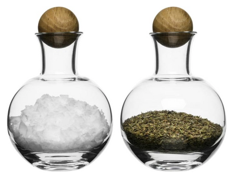 Lend a modern touch to your dinner service with Sagaform's spice storage set. The oak stopper makes these elegant enough to leave on the table. Designed to keep your condiments fresh and secure, use for salt and pepper or other herbs. Glass with oak stopper. 4 1/8"