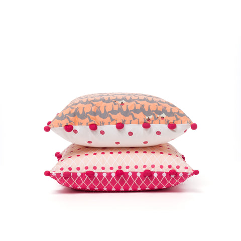Safomasi's Pushkar textile collection is inspired by the thousands of camels brought each year to the Pushkar Camel Fair for trade. Traders, tourists, locals and decorated camels are a sight to behold at Pushkar, and the collection is inspired by the colors and ornaments of the fair. The Net Block Cushion is a perfect compliment to the Different Different Camels and Camel Traders cushions, in coordinating orange and fuchsia criss-cross print with pom pom embellishment.  Hand screenprinted 100% cotton poplin. Cover only. Dry clean. 18" x 18"