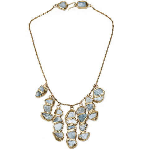 Emily Shapiro's stunning Seafaring Cascading Necklace with rough cut aquamarine stones embedded in recycled brass drapes beautifully at the neckline. The natural imperfections of the iridescent, blue gemstones are visible on both sides of the cascading pendants. Unique closure has two set gemstones at the clasp. Seven pendants hang individually on 16" recycled brass chain. Pendants measure approximately 1/2" to 2"; the shape and size will vary slightly with the gemstones.