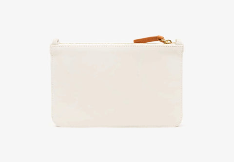 Clare V's wallet clutch in alba white. Holds smartphone, small wallet and keys with a little room to spare. Transform into crossbody or shoulder bag with strap. White zipper; brass hardware and cotton chambray lining. No interior pockets or compartments. Italian vegetable-tanned goatskin. Wipe clean with a soft, dry cloth. 8" x 5"