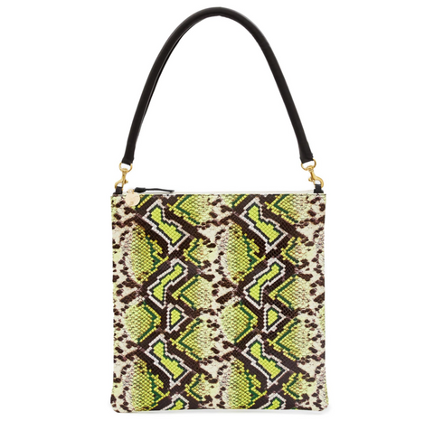 Make a bold statement with Clare V's folder clutch in yellow Riviera "snake". Holds smartphone, small wallet and keys with room to spare. Fold-over cream zip top with logo disc pull and top tabs for strap attachment (sold separately). By adding a shoulder strap onto the end tabs, you convert the clutch into a mini zip-top tote. Made of embossed Italian cowhide with brass hardware and cotton chambray lining. No interior pockets or compartments. Wipe gently with damp cloth to maintain the three dimensional quality. 11 1/2" square unfolded.