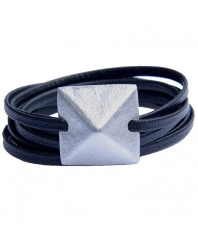 Edgy and cool, this wrap bracelet goes beyond adornment to tell the story of how Laos became the most bombed nation in history during the Vietnam War era. Each Rock Stud is hand cast in Laos of metal from bombs, plane parts and other aluminum scrap remnants, and then laced onto metallic silver leather.  Wrap around wrist and cut excess leather if necessary. While leather can resist water, we recommend removing in water to maintain optimal condition. Comes with additional leather strip in black. Stud measures 7/8" x 7/9".