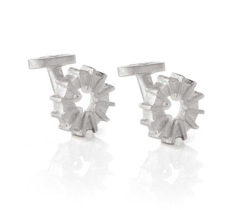 Pico Design's Guggenheim Oculus Cufflinks made of recycled matte sterling silver pay tribute to Frank Lloyd Wright's famed Oculus at the Guggenheim Museum in New York City. The geometric lines and open design give a structural silhouette. Single post with no moving parts. 1/2" diameter.