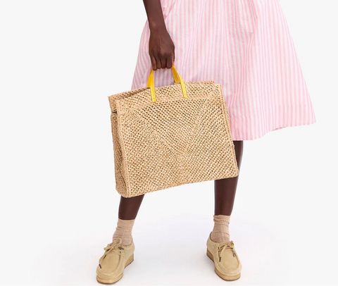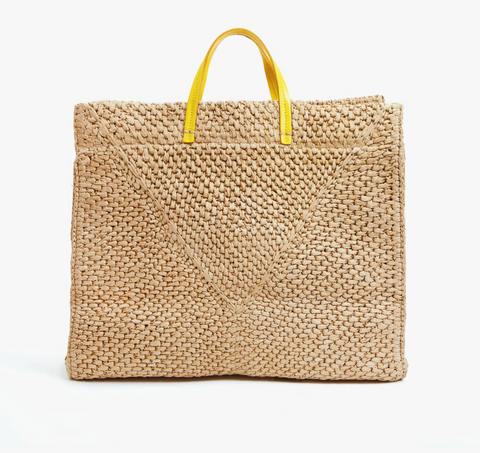 Effortless dune raffia simple summer tote from Clare V. Lemon yellow leather op handles and 26" removable shoulder strap. Lined in chambray; interior drop pocket; structured, flat bottom. Fits a 17” laptop. 15 " x 13" x 6 1/2